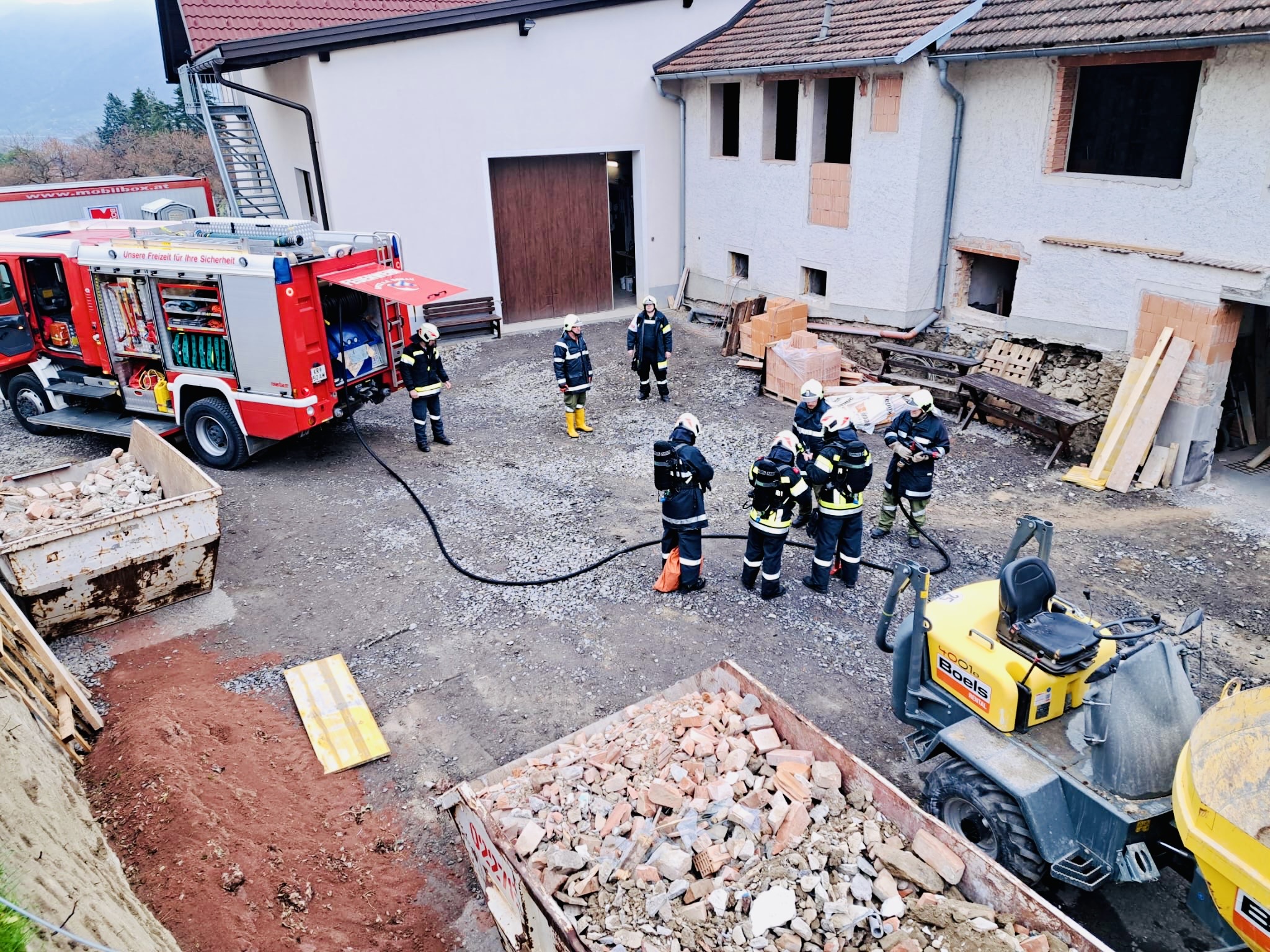 Als Szenario wurde ein Keller- bzw. Heizraumbrand in einem Spitzer Weingut angenommen. Ziel war es, die Zusammenarbeit mehrerer Trupps unter realitätsnahen Bedingungen sowie den Löschangriff und die Menschenrettung zu trainieren.